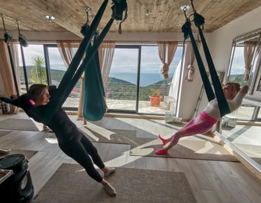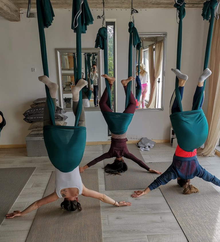 Aerial Yoga lifts traditional practice off the ground, using silk hammocks to support and expand movement.